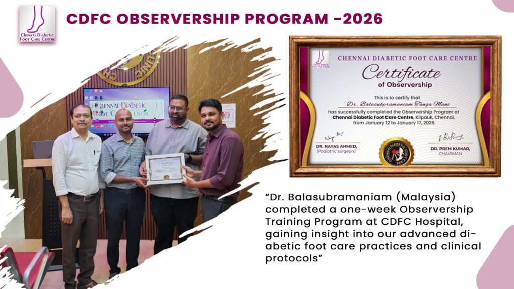 Dr. Balasubramaniam from Malaysia recently visited CDFC Hospital to participate in a one-week Observership Training Program. During this program, he observed our comprehensive approach to advanced diabetic foot care, limb salvage, and podiatry-based clinical protocols.