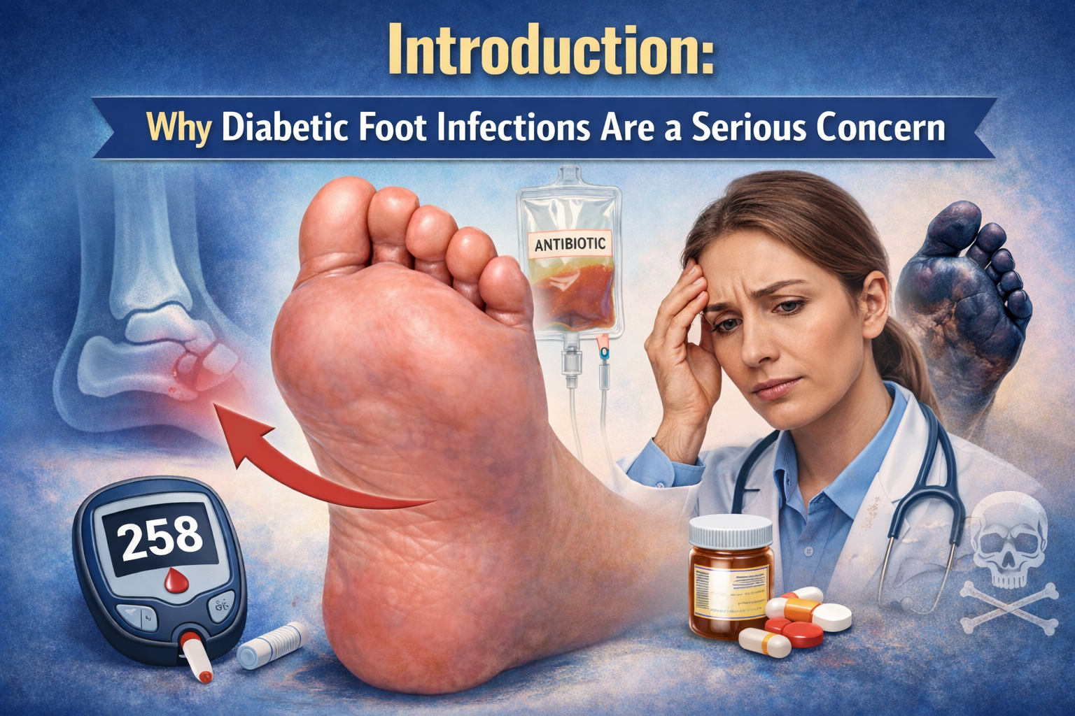 Infection is one of the most serious complications of diabetic foot ulcers and can rapidly lead to osteomyelitis, sepsis, and amputation. Effective infection management involves both local and systemic approaches.